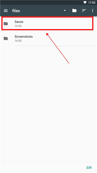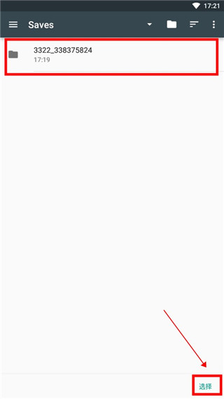 注意:文件查找到这里就可以停止了,在进入【Saves】后就可以点击下方的选择了。这里出现的【3322】文件是我们刚才第一个步骤建立的游戏存档,我们不需要进入游戏存档中,进入游戏存档中再点选择是无效的。