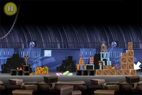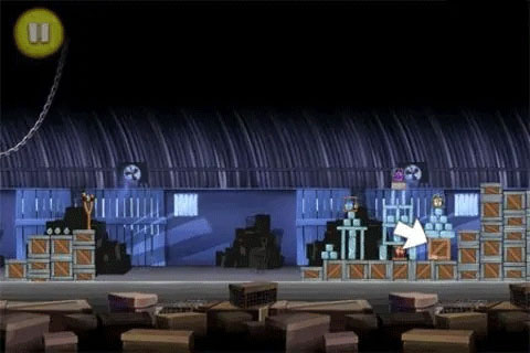 3、凤梨隐藏在箱子堆下右侧的箱子里头,同样贴了个标签。向高空发射一只蓝色的小鸟,如果它准确着陆了就可以炸开这个箱子。因为难度较大,所以你可能得多次连击,才有可能炸开箱子。