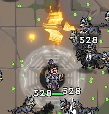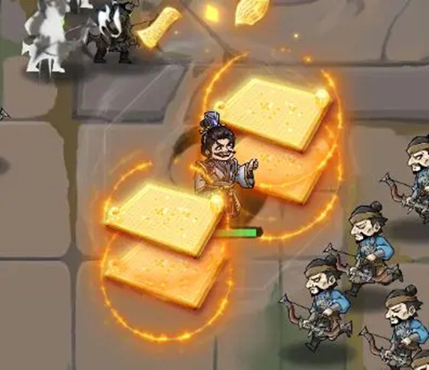 召唤一个策论书简,给最近的怪物造成范围【召唤】伤害后,化为小纸张;随机角度飞向怪物最名的方向,造成二段伤害