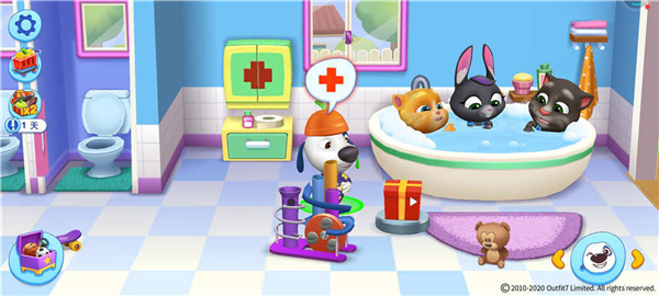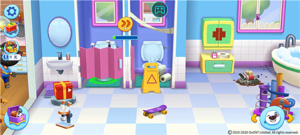 例如下图中狗狗的头顶出现了“淋浴”的标志,说明它现在想要洗澡,点击它的头顶,便会来到浴室旁,在点击浴室即可。