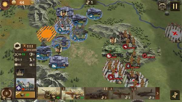 将军的荣耀3钢铁命令官方正版是一款以第二次世界大战为背景的战争策略游戏。该游戏由全新的引擎制作,可以让玩家在游戏中体验到战场上真实而丰富的地形。游戏中包含6个战区120个历史剧本,多达200多个国家的军事单位,超过100位名将和60多种特种部队,都将加入你的战场。玩家可以从轴心国和同盟国中分别体验这些真实的历史战役,并达成战役中的任务目标。进行招募部队、空袭、空降、派遣特种部队以及将领、雇佣援军,你的每个决策都将决定战役的走向。第二次世界大战已经拉开序幕,巴顿、朱可夫、麦克阿瑟、古德里安、蒙哥马利、艾森豪威尔、曼施坦因等超过100位名将依次登场。玩家需要利用将军们各自的特长,找出敌军的弱点并击败他们。德军虎式坦克、卡尔大炮、苏军喀秋莎火箭炮、KV坦克、美军82空降团、英军皇家S.A.S团等超过60种特种部队等你来招募。每场战斗都是消耗战,用有限的兵力发挥最大的战斗力,制定合理战术,有效利用地形,让你的队伍在艰难的战场上生存下来。尽快达成目标,消灭敌人并减少部队伤亡,从而获得高分。每场战役开始前,都需要玩家仔细的部署陆军,空军和海军,灵活的使用集团军,进行大纵深立体化的军事打击。
