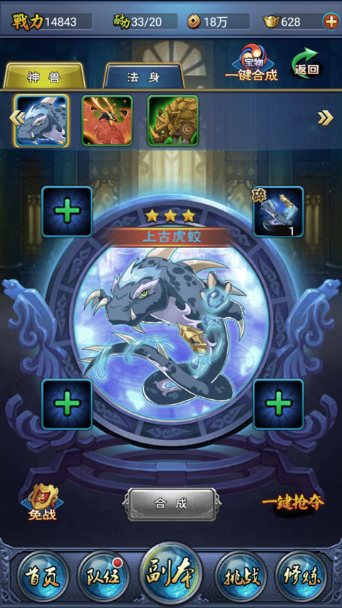 新大主宰中夺宝系统是获得法身和神兽两项装备的主要系统,法身和神兽以碎片的形式存在,只有凑齐所有的碎片,即可合成完成的法身和神兽。点击缺失的碎片部位,即可抢夺其他玩家身上携带的碎片,抢夺成功既有几率获得对手的碎片,高级法身和神兽碎片也在可以在这里抢夺!