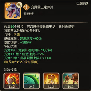 首冲变异霸王龙礼包:属于加成内政龙宠,它的军团技能与建设息息相关。前期可以节约很多时间,加速发展,用了就知道有多好!有变异霸王龙的帮助,能在抵御入侵者中快速通关。