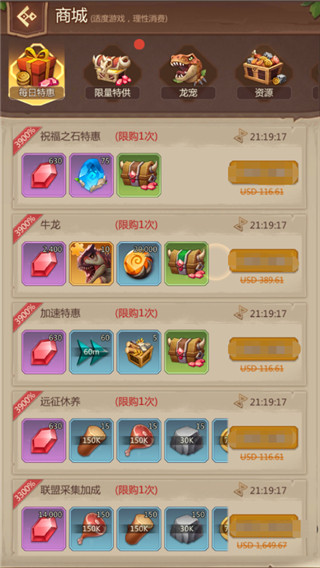 每日特惠:能满足各种需求的礼包,例如龙宠、加速道具、资源、装备等。购买后会升级下一档位同品种道具,建议配合当日活动购买。