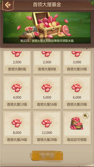 (三)首领大屋基金购买后。首领大屋达到制定等级可领取水晶,对于爱升首领大屋的玩家来说是一个非常搞性价比的礼包,能获得非常多的水晶。