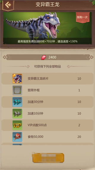 (四)变异霸王龙进阶礼包获得更多的变异霸王龙碎片,升星变异霸王龙,拥有更快的建造速度、更多的免费加速时间。