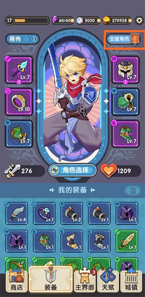 当你拥有4个英雄时,助战支援系统开启。在装备界面的右上角,点击支援角色,除了获得英雄的属性加成外,还能获得支援英雄的初始秘宝加持。