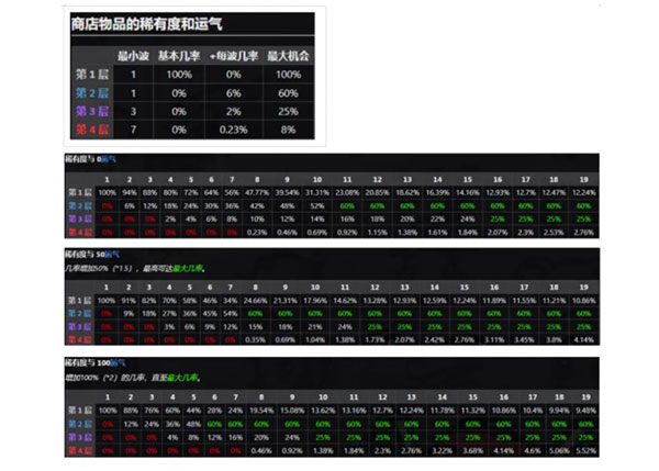 ⑥关于幸运这一条属性解释起来比较复杂,它的核心数据是乘算机制,商店里的道具随着回合数的增加是加减机制去逐渐提升,但不会超过一个最大值,除了【幸运儿】这个特殊职业以外,我的建议是以0-50-100这三个数值去堆,高幸运带来商店提高刷新高品级道具和武器,以及击杀小怪后能更高几率掉落会回血道具【能让你少堆一些生存向属性多堆伤害】能够帮助你更容易通关。当然如果你是欧皇,请无视本条意见。数据党参考下图: