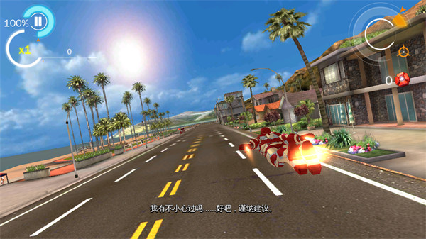 游戏并不是只有一个地图,和神庙逃亡2魔境仙踪采用副本地图类似,在钢铁侠3游戏中,有一个距离计数表,也就是画面右上角的那个圆圈,只要你跑到足够的距离,圆圈就会充满,然后你就会前往下一个关卡,但是在此之前,玩家或许会遇到各种各样的BOSS,这些BOSS无一不是强力的装甲。