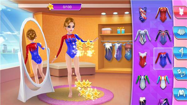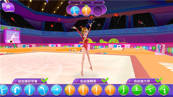 体操之星,一款由Coco Play公司清卡开发的休闲益智类体育竞技小游戏。不仅题材新颖、玩法独特、拥有十分卡通Q萌的画面风格、顶级的3D特效场景,以及完美还原了多项运行项目、和各式各样的华丽服饰、运动服等元素内容可供玩家自由选择操作,并为角色完成打扮之外。同时游戏好玩有趣,在这了你将扮演一个体操远动员,不但可以如愿以偿进入了国家队,代表国家参加体操比赛,亦或是参加奥运会,争夺金牌。最重要的是在此之前,你需要和著名的教练一起训练,学会各种体操技巧,包括挺身侧空翻、直体空翻三周跳、曲体三周跳等,不断提升技巧和熟练度。同时选定为一套你认为最好看的造型,为即将举行的奥运赛准做好充足的准备,以便可以在各大比赛中发挥你的想象设计出满分动作,争取在大赛上的得到更高的分数,征服教练和观众成为你的粉丝,一路绿灯进入了奥运赛事。为你的国家而战!