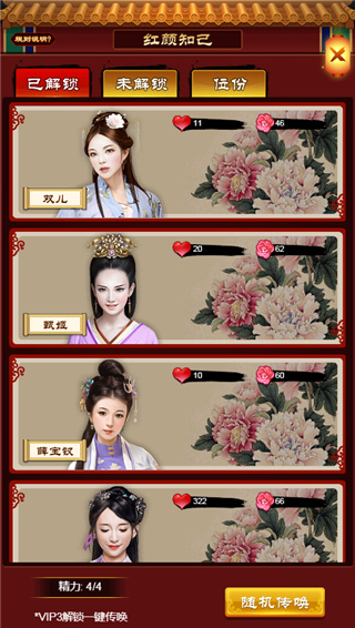 老爷进入府内后,可以对已拥有的红颜进行随机传唤,传唤到的红颜是随机的。