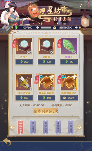 修行圣地会掉落集市的金币、修行币、饲灵丸等一些道具,优先挑战层级高的关卡,挑战到次数用完就可以停下。给幻神更换下装备,甚至可以强化一下装备,但注意分类型强化,坦克优先强化衣服和帽子、输出优先强化武器然后呢就可以去观星访市逛逛啦,看看现在的资源数量能够购买什么。