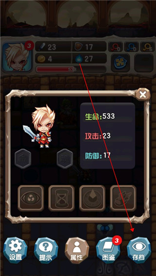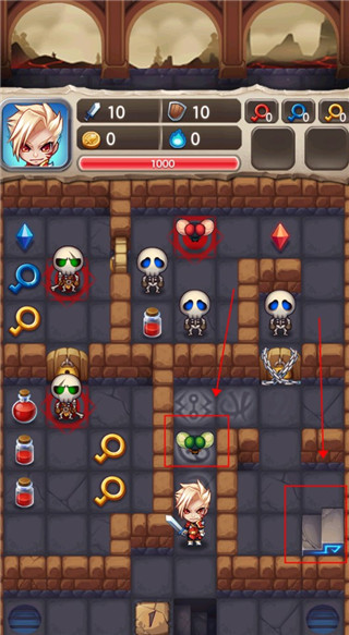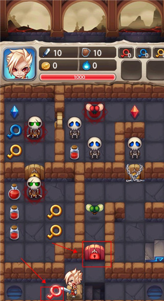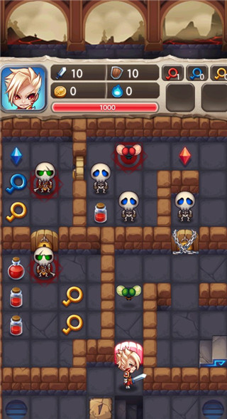 游戏中我们除了依靠智慧和逻辑推理来完成收集钥匙挑战关卡之外,最重要的还是人物的成长过程,玩家们要收集红宝石、蓝宝石来增加角色的攻击和防御,收集血瓶来增加血量等等,通过属性的不断强化来提升自己的战斗力。