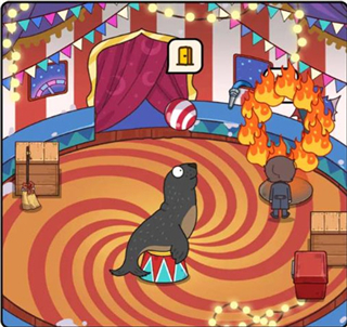 把抓娃娃机里的小仓鼠抓出来,和帐篷右边的仓鼠放到一起发电(如果帐篷里黑了就要出来点一下仓鼠)。走到帐篷里把地上的球给海豹,根据海豹顶球规律得到红箱子密码324,打开箱子拿走水管和钥匙,出去把水管接到消防栓上打开消防栓,另一头放到帐篷里,回到火圈前面,用水管的水灭火,从后面出去,用钥匙打开红色车门,点击红色按钮打开车灯,到光线处把光斑拼成一个圆,回车里拿出钳子,用其帮小猫逃生即可。