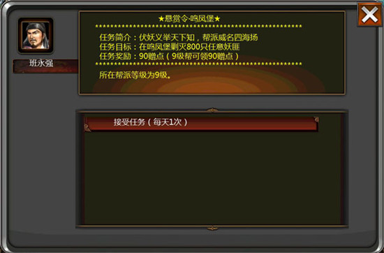 为增强帮派实力,提升自己在帮派中的地位,侠士每天可到班永强那里完成帮派征集任务。每完成1次帮派征集任务可获得海量经验。当天完成3次帮派征集任务,还能为所属帮派增加2万帮派资金,并提升1级帮派成员荣誉等级。