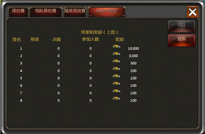 比赛结束后,大赛将以战绩积分决定各大帮派谁主沉浮。并排出比赛的前八强名次坐席。帮派成员则根据功绩点获得相应比例的赠点奖励。