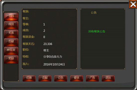 1、加入帮派后,侠士们可在“帮派”界面里的“资料”界面之中看到关于本帮的帮派等级、帮派资金等基本信息。同时在右侧的公告栏里还可以看到帮主发布的公告。帮派成员可点击本界面下方的“贡献”按钮,给帮派捐赠天石或银两并获得相应的贡献值。当贡献值达到一定数值时,就会自动获得相应的帮派职位。