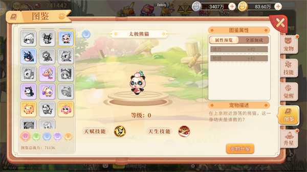 根据宠物星级提升图鉴等级,对应提升属性加成。若宠物放生,则图鉴变灰,加成失效。