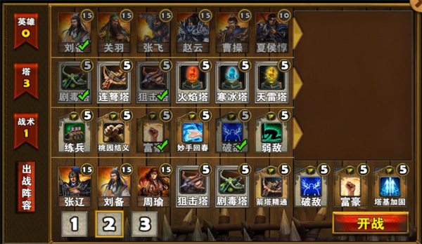 (1)开局升级粮仓加钱技能升满3次,多余钱在左右应敌两侧各建一个毒塔并升满。留一个武将坐镇基地,