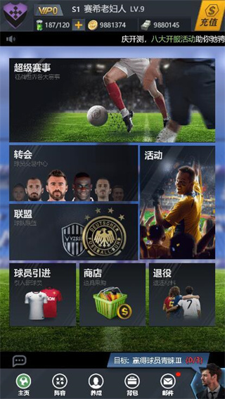 1、主界面布局简单,一目了然,整体风格比较简约精致,界面的最上方,从左至右依次是玩家的球队队徽、球家昵称、体力值、金币、资金。而在主界面的主要区域,可以看到超级赛事、转会、联盟、活动、球员引进、商店、退役等多个入口。底部则是主页、阵容、养成、背包、邮件等功能入口。
