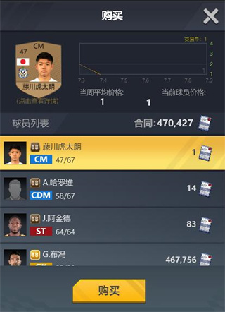 输入框输入球员姓名的关键字后点击搜索按钮会展示所有包含该关键字的所有球员,列表右侧会展示球员的实力和场上位置,选中想要的球员后点击确定按钮,会打开该球员的信息界面。合同数够时,点击购买按钮即可签约该球员。