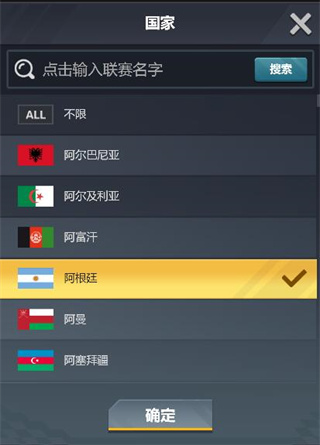 该列表会显示各个国家,搜索框可输入关键字搜索想选择的国家,选中想选择的国家点击确定按钮即可。继续点击搜索即可查看所有该国家的球员信息。