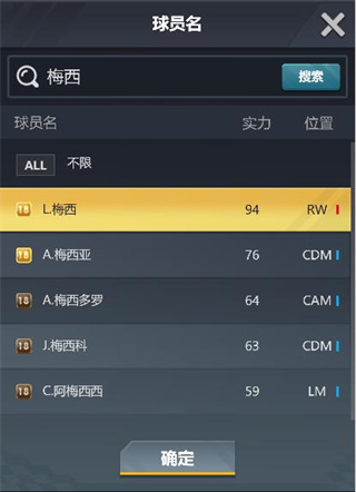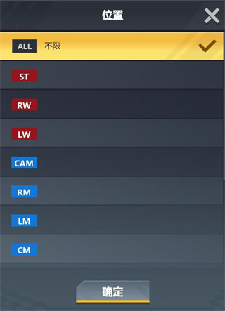 该列表会显示场上所有的位置,红色为前锋,蓝色为中场,绿色为后卫,选中想选择的位置后点击确定按钮即可。继续点击搜索即可查看所有该位置的球员信息。
