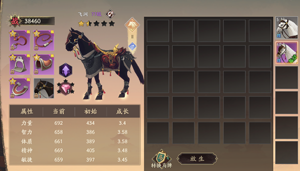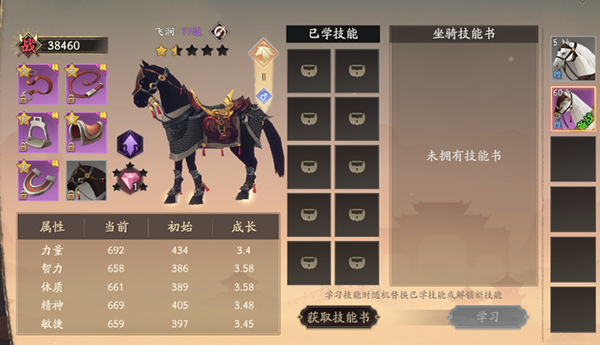 2、马匹通过改良可以提升坐骑的力量、智力、体质、精神、敏捷五个属性。