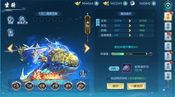 通过界面的坐骑按钮,点击一下就能打开坐骑界面了,在界面中可以看到各种属性加成数值。培养坐骑进阶可以提升这些属性数值,以及解锁更多技能或更拉风的外形。