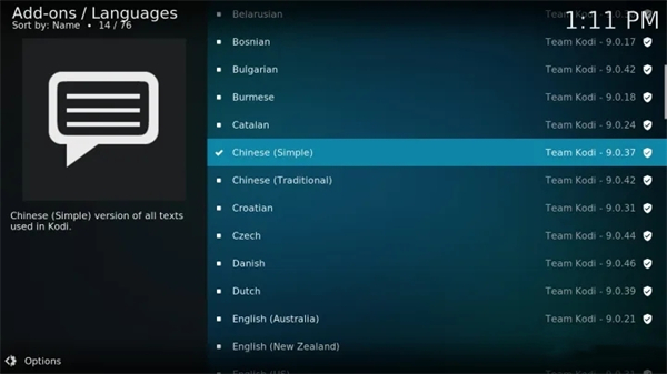 此时返回到主界面,点击Add-on(插件),找到“Install From Repository”,再依次选择Look & feel→language,找到中文简体Chinese(Simple),安装后启用,即可启用中文界面。