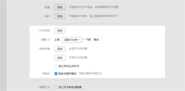 添加企业的上下班时间,你还可以在高级设置中设置允许迟到、早退的分钟数等,设计更人性化的打卡方式。