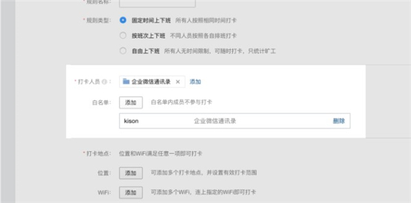 领导或者特殊员工可在此通过配置白名单,不参与打卡。