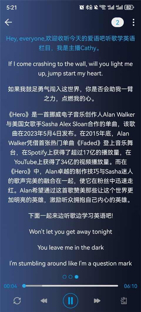 听歌学英语app是由爱语吧推出的一款英语学习软件,它的主旨是为了帮助用户能在一个较为放松的环境下学习英语,主要是提高听读能力。在品味欧美经典歌曲的同时,全面的提高听力和增加词汇量。它在显示英文歌词的基础上附带了英文讲解,逐字逐句为你解说歌词,熟悉英语中语法和用法。它能够让你放松的同时,通过听力让自己本能的记下单词的发音等各种关于口语方面的内容。