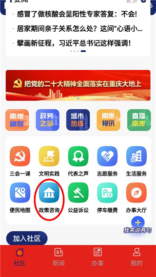 用户打开掌新南岸app,进入新闻资讯,即可查看或搜索南岸资讯。