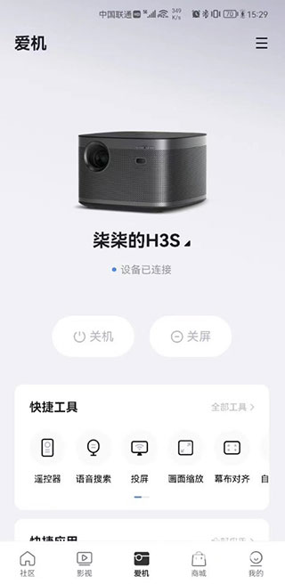 4、绑定成功后,手机App的【爱机】板块打开显示【设备已连接】,即可使用手机操作极米投影仪了!