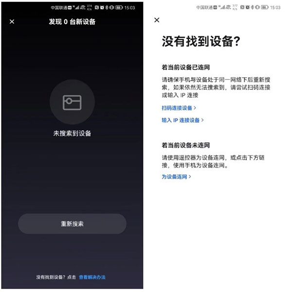 1、在搜索页面点击最下方的【查看解决方法】进入下一个页面,我们得到两种额外的连接方法:【扫码连接设备】和【输入IP连接设备】。