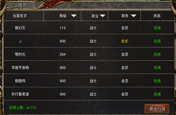 我们在成员界面查看会里的兄弟,最上面一排可以进行筛选,帮助各位了解会里的职业分布,以及等级情况。