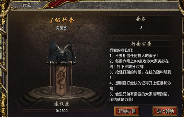 最直观的显示,我们可以看到目前行会的等级、建设度、会长和公告信息,在这个页面,会长可以进行行会扩建,我们则可以通过点击进入领地,进入自家行会的领地。