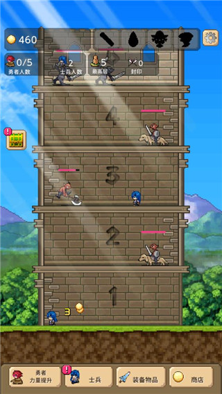 《勇者之塔》最新版本是一款结合了RPG、策略、冒险等多种玩法的2D像素风动作闯关手游。游戏以高塔为核心,每一层都是一个独立的关卡,玩家需要不断召集和升级各种兵种(如士兵、剑士、射手等),挑战层层关卡并解锁更高奖励。画面卡通细腻,音效轻松舒适,操作简单易上手,适合全年龄段玩家。