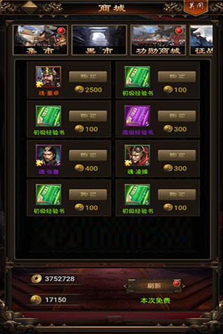 (5)远征商城:与功勋商店一样,前期买将魂,优先鲁肃4星加天赋1,其次夏侯惇和其他80资质的紫将。