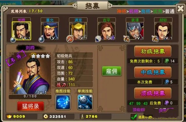 1、武将可分为5个级别:神将(橙色)、名将(紫色)、良将(蓝色)、普通(绿色)、庸才(白色)
