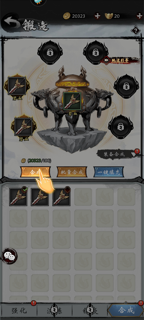 3、装备材料多的话可以一键合成高装备,后期还可以通过洗炼、镶嵌来提升装备属性