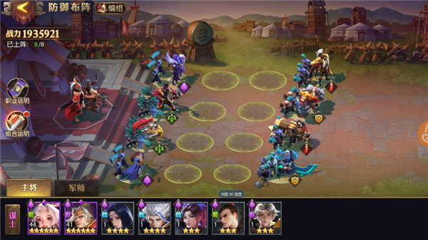 3、布阵指南:布阵时谋士也是在己方后排,由于技能效果大多是随机的所以站位不用考虑输出,只要放在安全的位置即可。