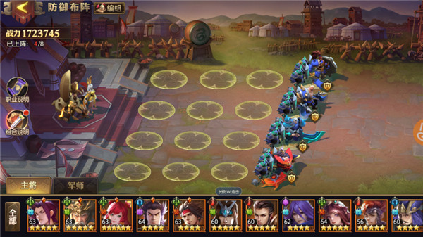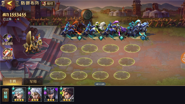 3、布阵指南:重骑武将集中到一行可以提高突破前排的效果,并且针对敌方防御较弱的前排更有对战优势,一旦冲入敌方后排几乎胜利在望。