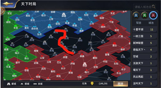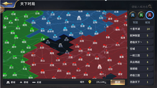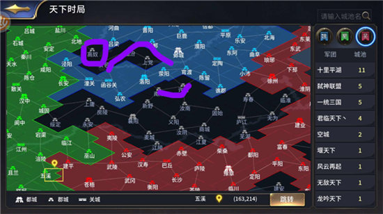 具体怎么玩呢?简单的讲,就是玩家从默认出生地(魏国在邺城,蜀国在成都,吴国在豫章)。挨个攻城掠地(只能打有行军线路且挨着已占领区域的城池),可以打未被占领的城池,也可以打被你所在国以外的其他两国占领的城池,达到三分天下的目的,甚至一统天下。