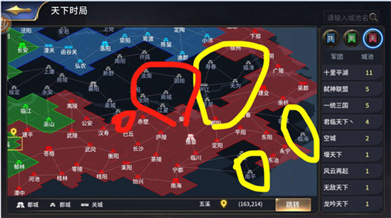 分析天下时局,制定行动纲领,紫色为敌国潜在的发展空间,黄圈内为吴成功圈地的城池,红色为拟占领和拟进攻路线