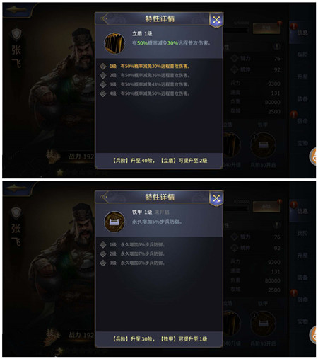 游戏内英雄分为:步兵,骑兵,弩兵,弓兵四种,每个英雄消耗军械和银两后都可以进阶,提升英雄属性,激活兵种特性。