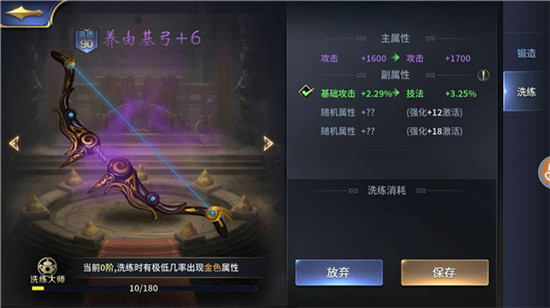 宝物左下角有“洗炼大师”功能,每次洗炼都会累计洗炼进度,进度值越高洗出紫色或金色属性概率越大