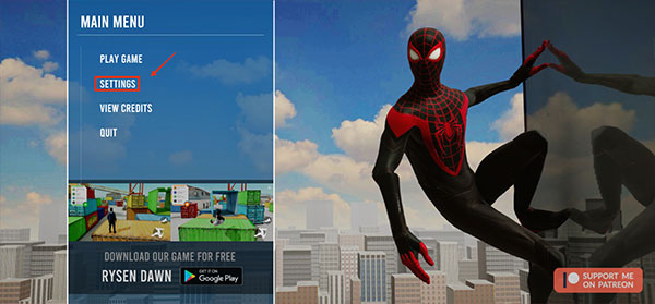 1、下载进入漫威蜘蛛侠彼得和迈尔斯游戏,玩家进入游戏之前可先点击“settings”打开设置;