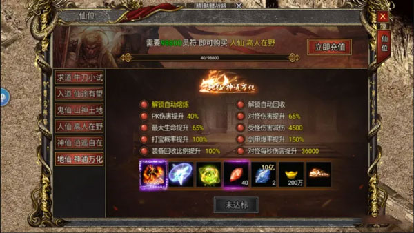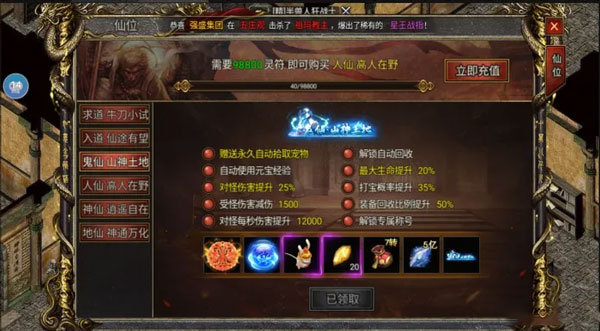 1、除了首充可以入手鬼仙,回收比例大幅提升!最重要的是可以解锁自动回收功!无忧挂机,通宵,第二天醒来背包神装全满。